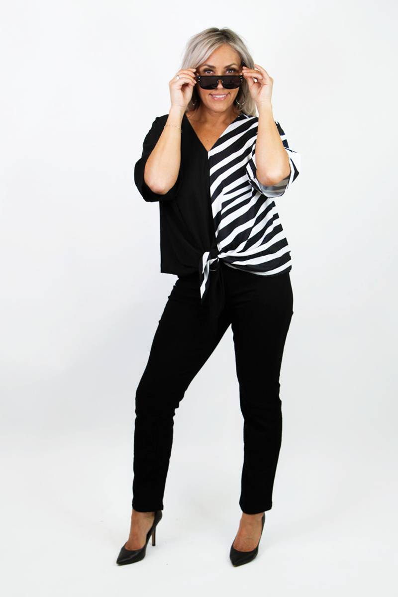 • Black & White Zebra Strip V-Neck Front Tie Top